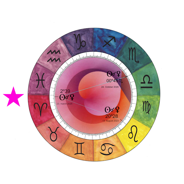 The 2º39 Aries point marked the current entrance point, and the Meta Goddess for the following 18 months (584 days, ending on October the 24th 2026) is informed by the archetype of Aries.8Some astrologers determine the Venus star point to be the so called heliacal rise, which is the day Venus becomes visible in the sky after her interior conjunction with the Sun. This point can vary between two signs as in this current period, where it can be located in Aries or Pisces according to where you live on Earth.This is a time to celebrate the pioneer and honour that archetype in ourselves, our communities, cultures, and in the global society.