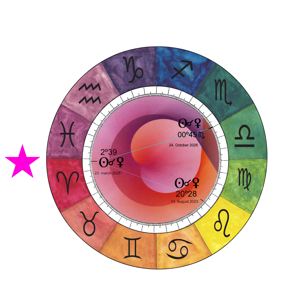 When you trace the movement of the Venus Star from your personal Venus Star Point and onwards, you will find specific dates where the Venus Star Point touches planets and points in your birth chart.